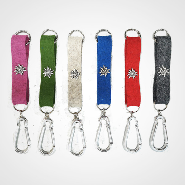 Bunte Schlüsselanhänger aus Trachtenfilz (100% Wolle) mit Edelweiss-Emblem, Karabinerhaken und Schlüsselring.
